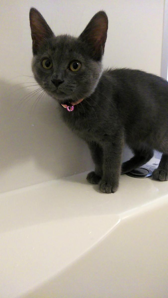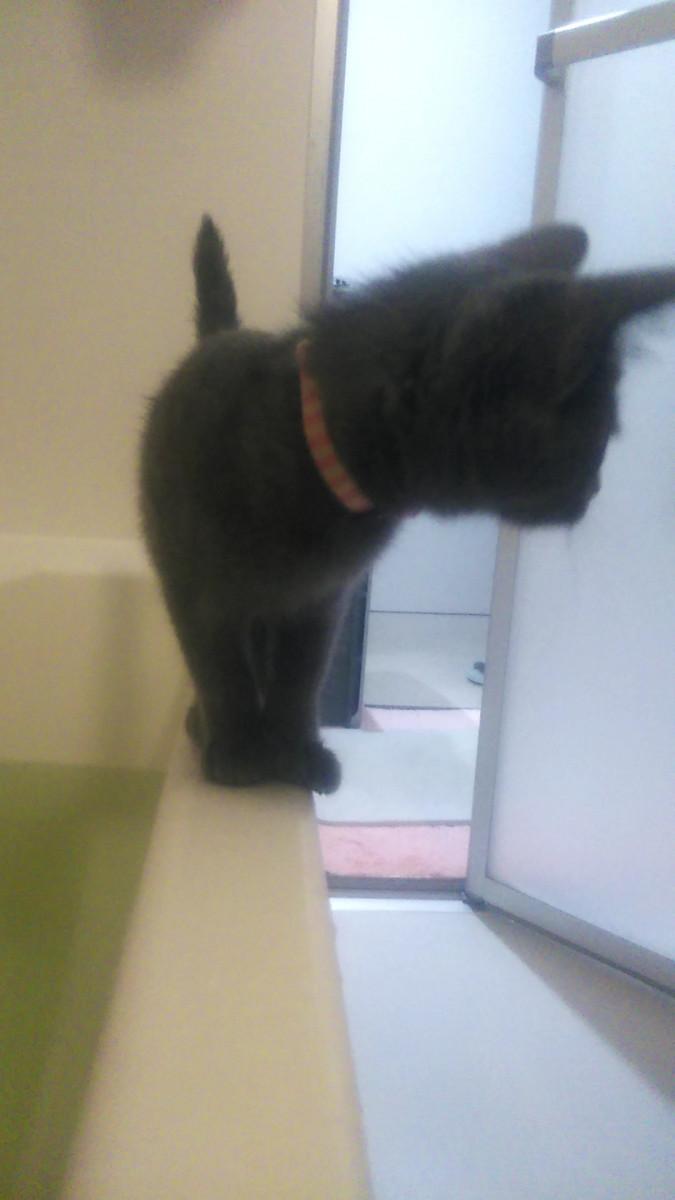 さくらは何でも興味津々、今日はお風呂場を探検。落ちるのではないかとヒヤヒヤしましたが、そこはやはり猫! バランス感覚抜群です。
