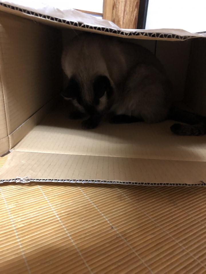 で、猫あるあるで入っていたダンボール箱が気に入ったみたいでいつも入っているんです。