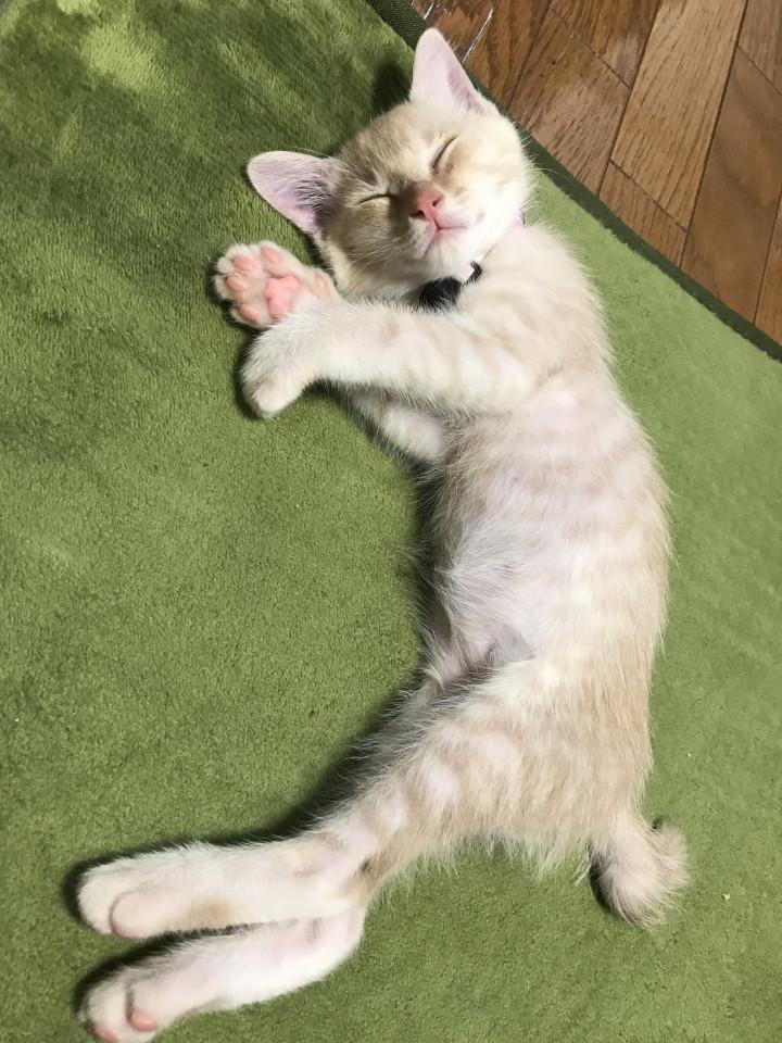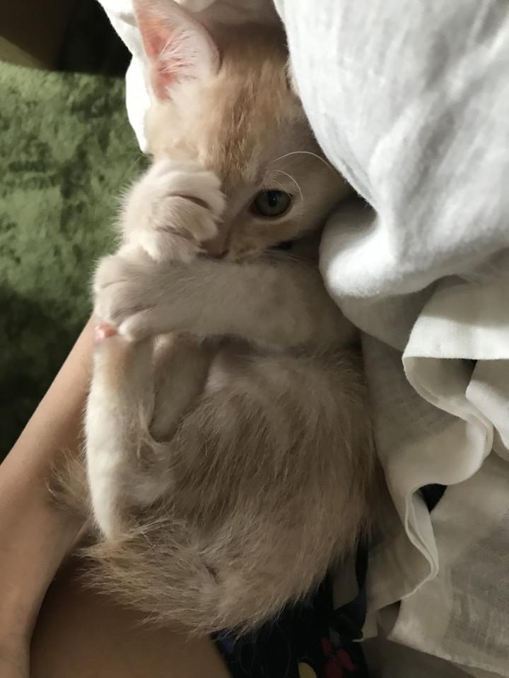 知人から引き取ってから10日、甘噛みはやめてくれませんが寝てる顔が気持ちよさそうで嬉しいです。体重も800gまで増えました。現在生後2ヶ月弱、良い猫生を送ってほしいです。