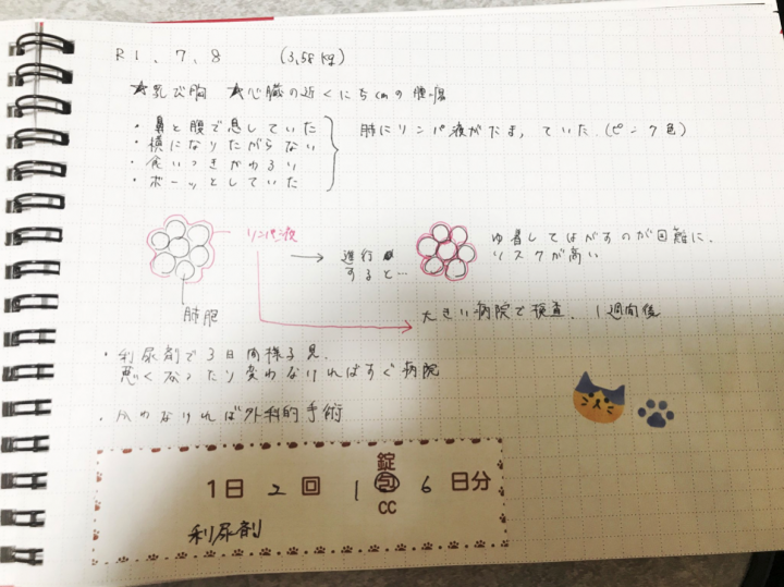 流れとしては、昨日から何となくぼーっとしていることが多く感じ、いつもおしゃべりしながら甘えてくるのですが、それがあまりない。そして横になろうとせずに座っていることが多かったです。今朝、呼吸がはやく感じ、鼻をヒクヒクさせながら呼吸をしていたのですぐ病院に朝一で連れて行きました。呼吸と走り回らないこと以外は本当にいつも通りだったのでよく観察しててよかったです。私の予想は的中、乳び胸です。