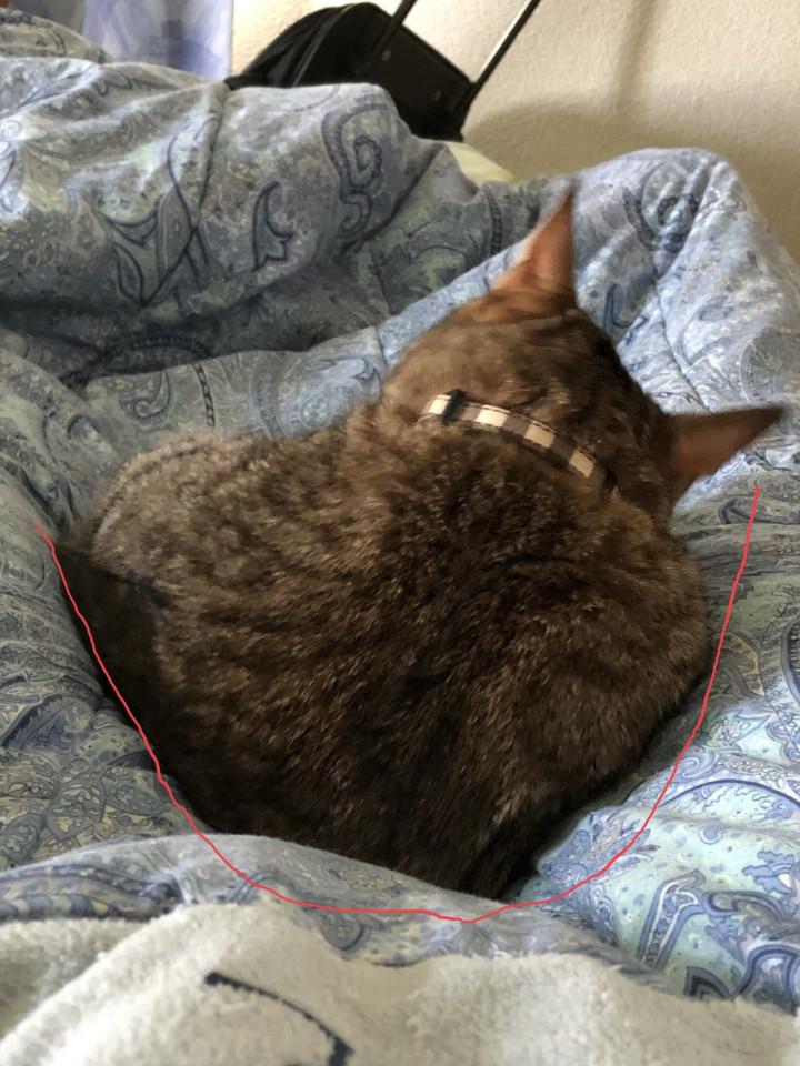 ただ、音楽流しながらベッドに横になりながら聞いている時、薄いタオルケット掛けているのですが、何故かその時は、タオルケットの上から股の間に入ってくつろぐのです(※写真の赤のラインが左右の足になります)。
