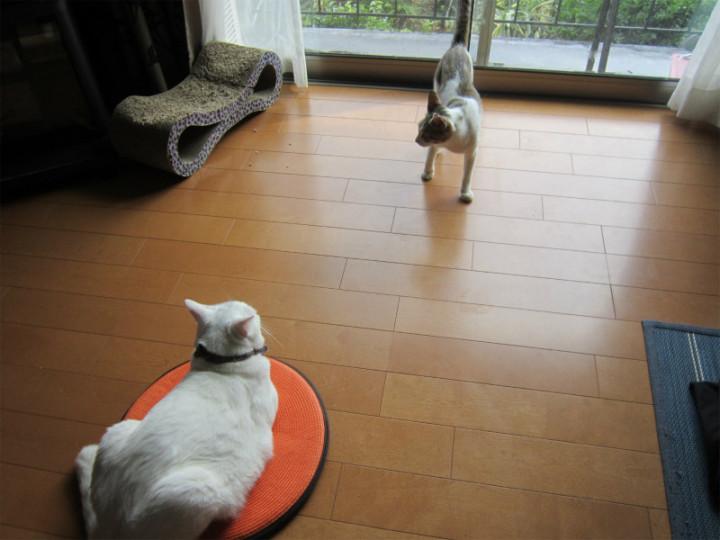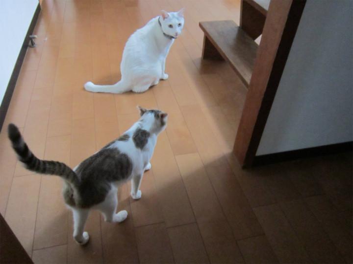 にゃにゃが2階に行くと一緒についていきます 二階では微妙な距離間で二匹ともリラックスしています