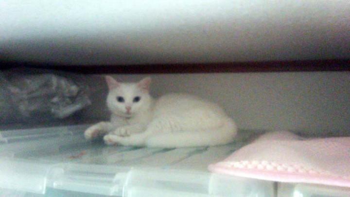 ここは二階のウォークイン・クローゼットの上の棚の衣装ケースの上です。