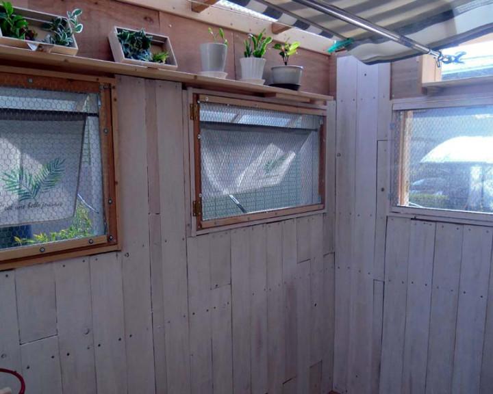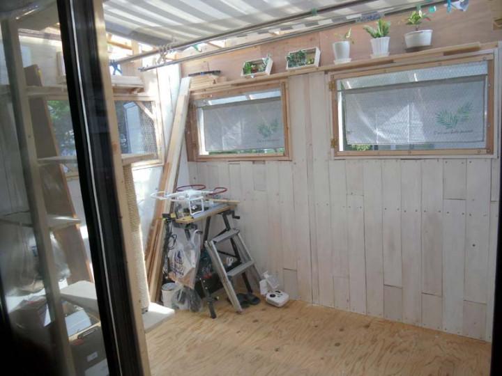 窓の上はキャット・ウォークにする予定でしたけど、急きょ変更して植物を置く棚にしました。仮設的にキャットウォークを付けてたのですが、全く使用して頂けない・・((+_+))