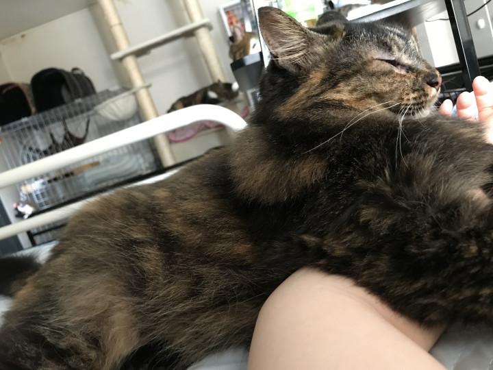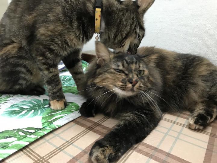 きっとユズ子ちゃんが、しつこ〜くグルーミングして、モモ子ちゃんに嫌がられたんだろうな…これで喧嘩に発展する事がちょくちょくあります。