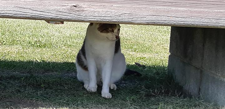 チャトラがいた物置の、すぐ近くのベンチ下にいたのはキジシロ(白多め)。