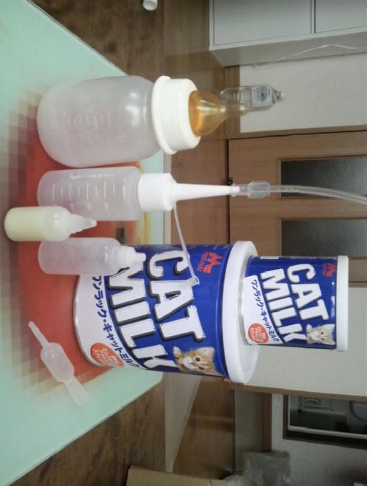 私の指を吸っているネコの口の横から哺乳瓶をちょっと差し込むやり方で