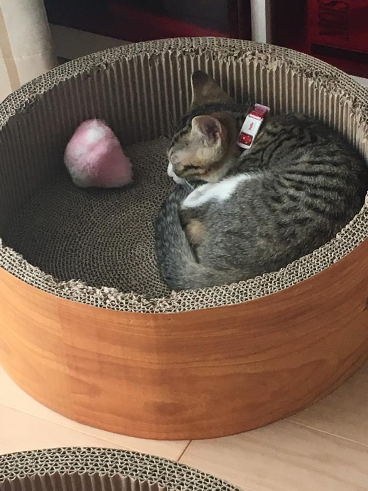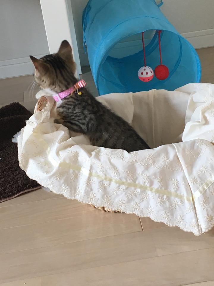 気がついたら籐籠もガジガジかじっており、切れ端も転がってた!飲み込んだらどうしよう、と慌てて回収。