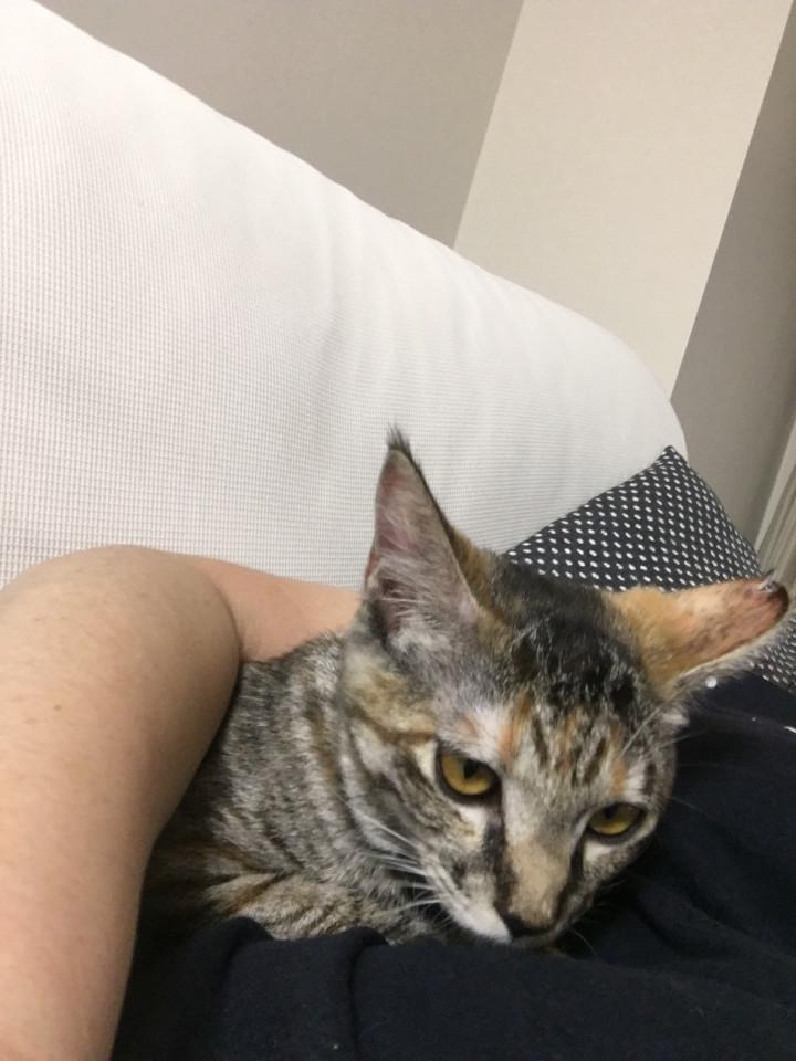 ポンズは私の腕やワキに頭を突っ込んで、スリスリなでなでの強制。その後はふみふみ。お腹をギュッと不意打ちで押されると、一瞬ウッとなるんですけど…。