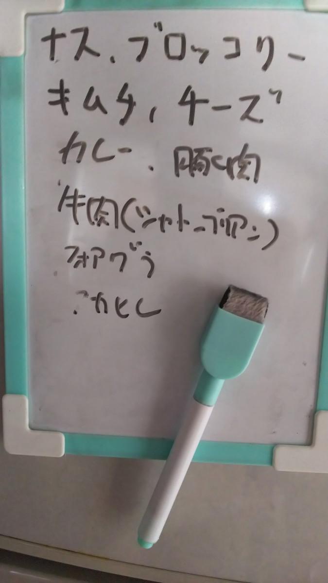 買い物し忘れないように、冷蔵庫にボードつけてメモしてるのですが。家族に落書きされました(泣)。三段目から下が夫…四段目からちょっとおかしいです。こんなの買えないから(^_^;)