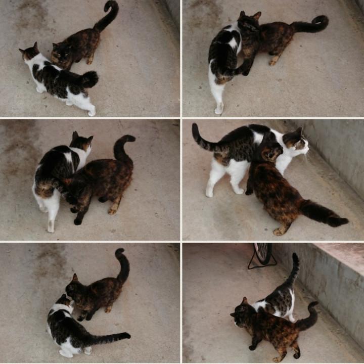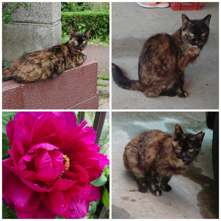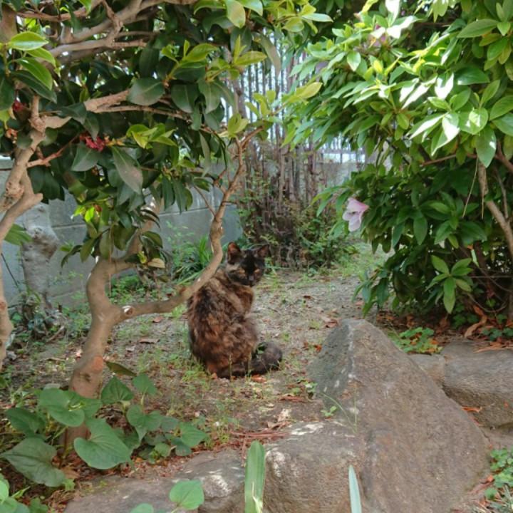 パステル三毛の子、孫ばかりの庭に突然現れた子猫。