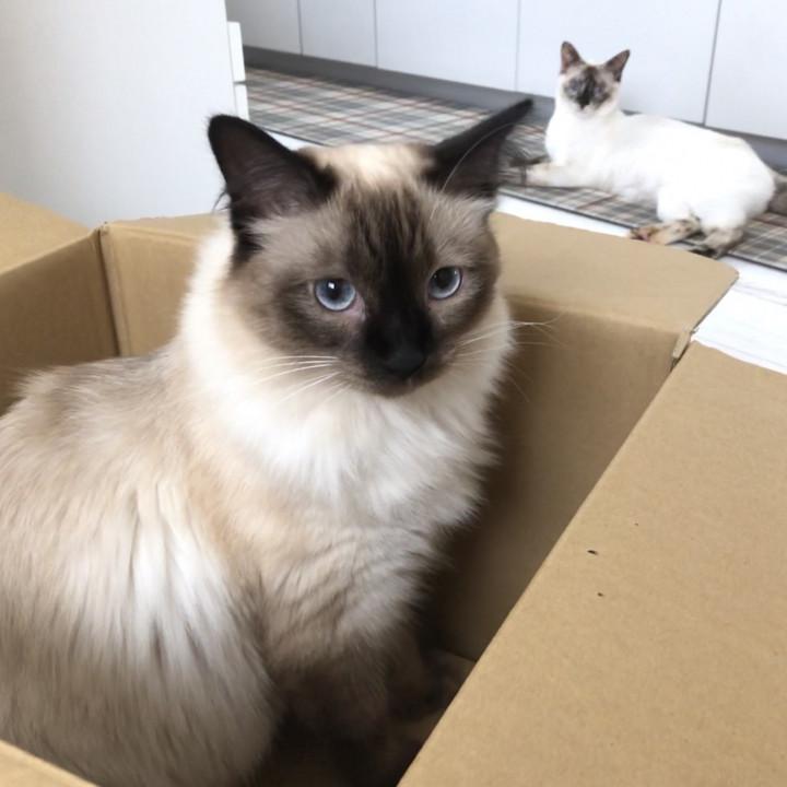 入浴前、呑気に箱で遊んでいる雷牙と後ろで休んでいる美鈴😸🐱