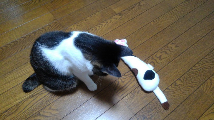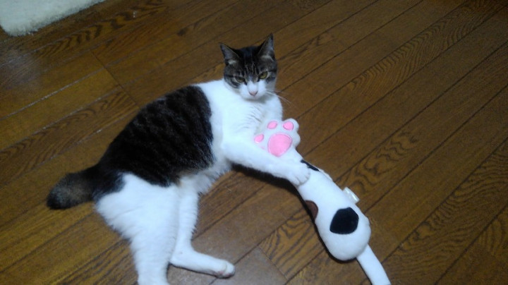 いつも遊んでます♬ 尻尾の部分を触るとシャカシャカ音がするやつなので、最初は苦手かな?と思ったのですけど、気に入ってくれてなによりです^^