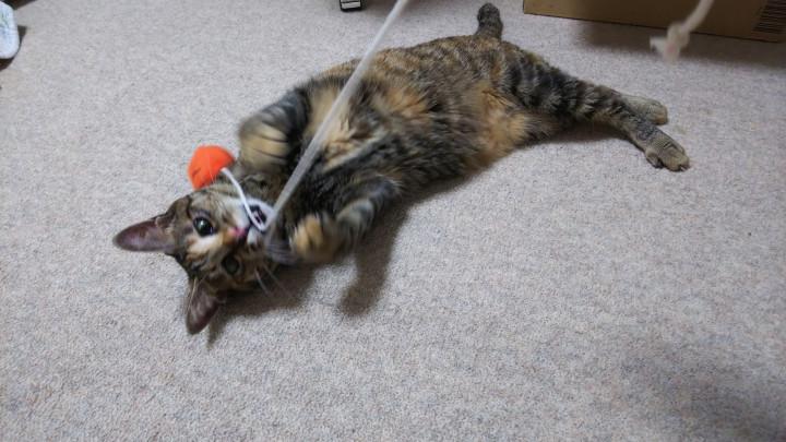 扉閉めて隠してたオモチャ、咥えて持ってきました。ひもが心配なので、私が居ない時は違う場所に隠そう…