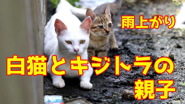 雨上がりに白猫とキジトラ親子を撮影しました。
