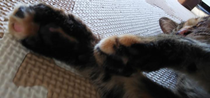 黒い肉球の中に、ピンクの肉球が1つ。レーズンちゃんのチャームポイント。