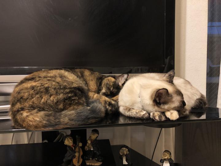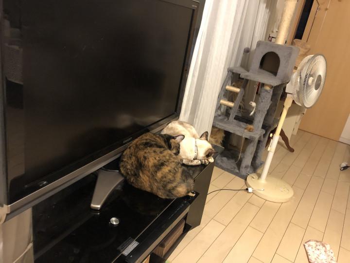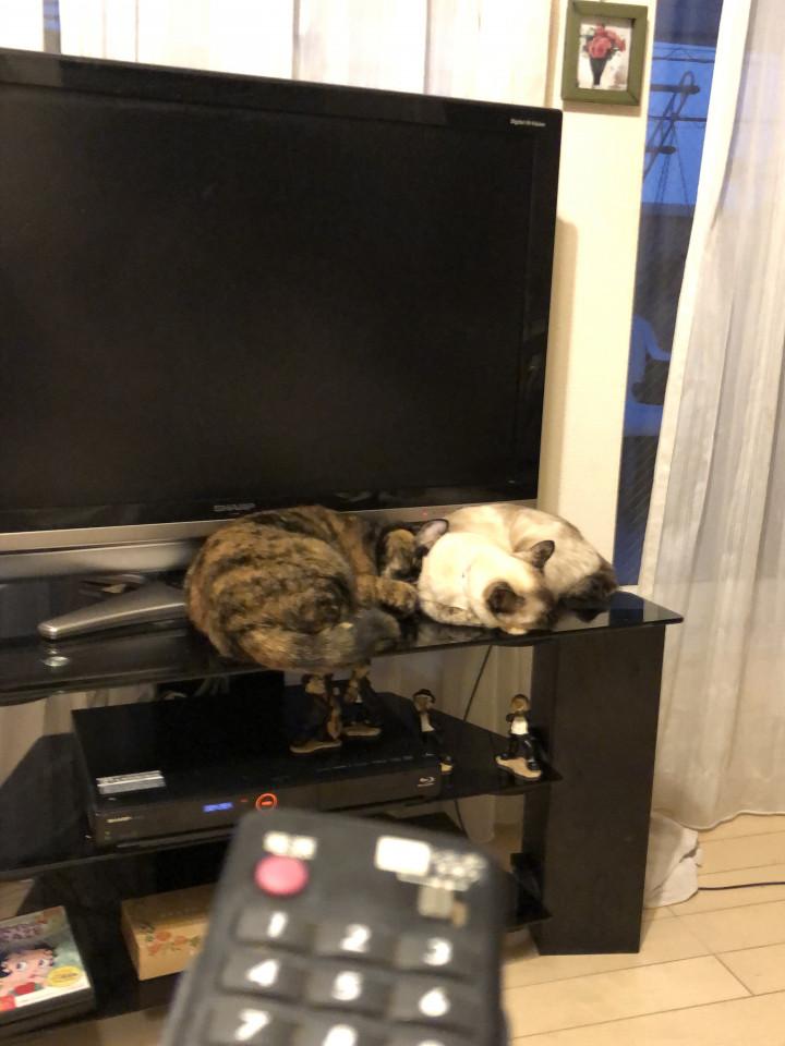 なぜそこで寝る!テレビのリモコン電源入れなれないんですけど!