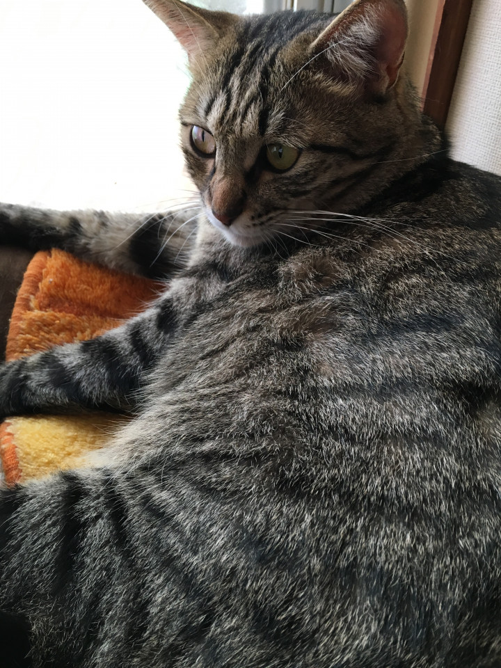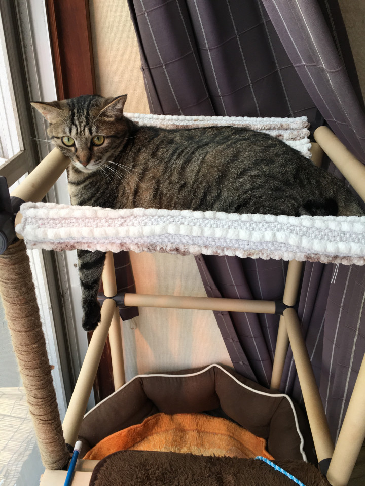 お手製キャットタワー大活躍で作った甲斐がありました♬⇦作ったのは主人と子供達で、私はニャンモックを縫っただけです笑