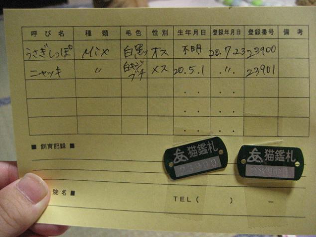 ↓これがうさとニャッキの登録証と猫鑑札です。