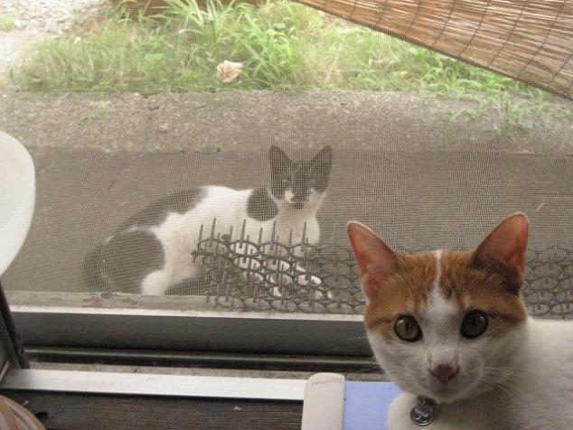 離れをのぞいて、にゃーにゃー良く鳴いています。