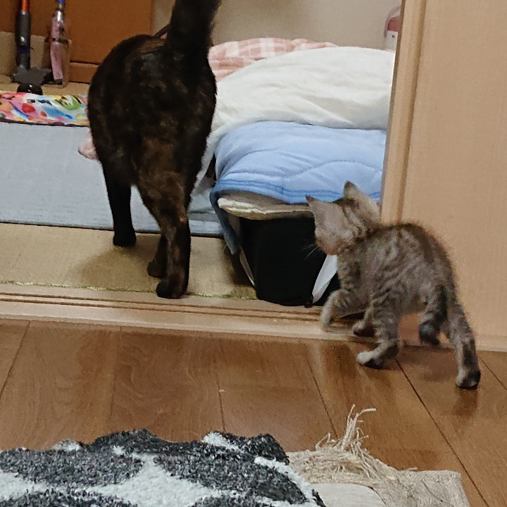 家族以外の人間には、決して近寄ることをしなかったのに、子猫のシマ目当てで来客があると、まずは、自分からすり寄って挨拶するようになり、抱っこされているシマから目を離さない。