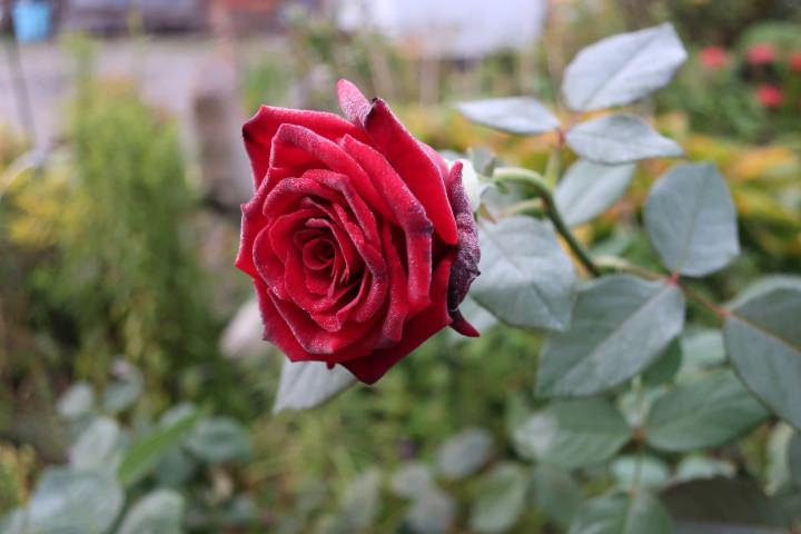 秋バラに霜がついていました。秋のバラは色が濃くてきれいです。
