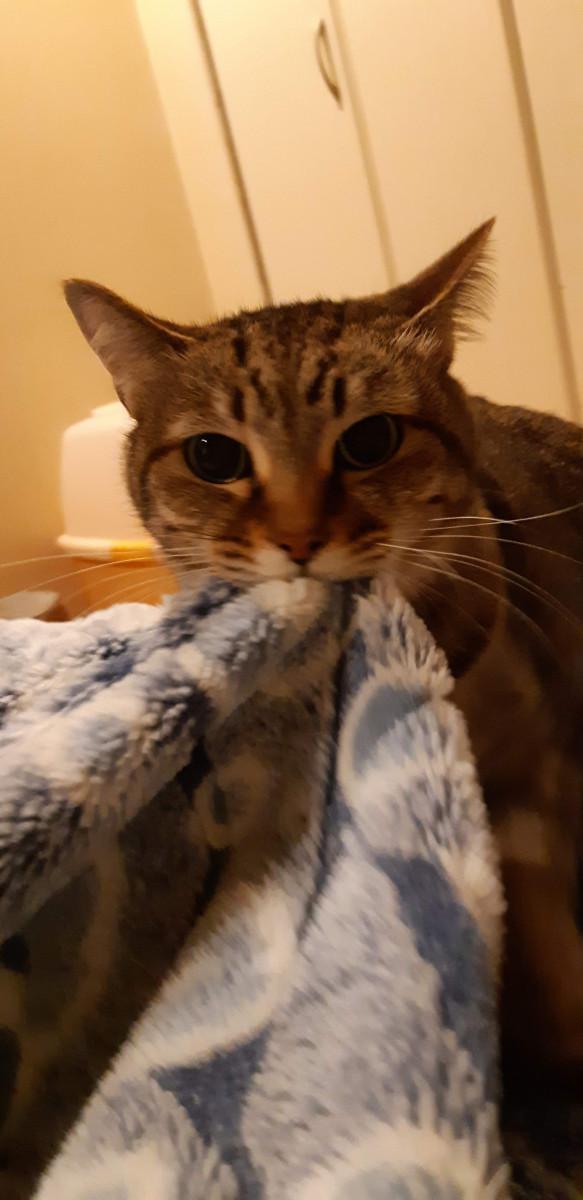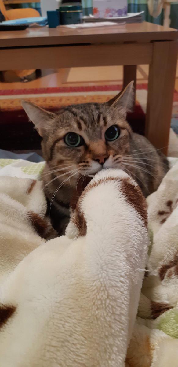 ダンナさんが布団を畳む前に、やっぱりハミるところを探してたので、口許に毛布を差し出してあげました。