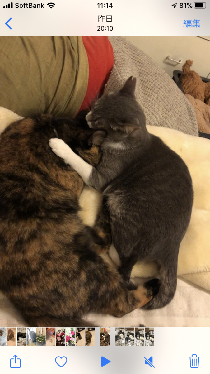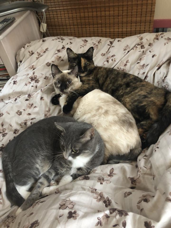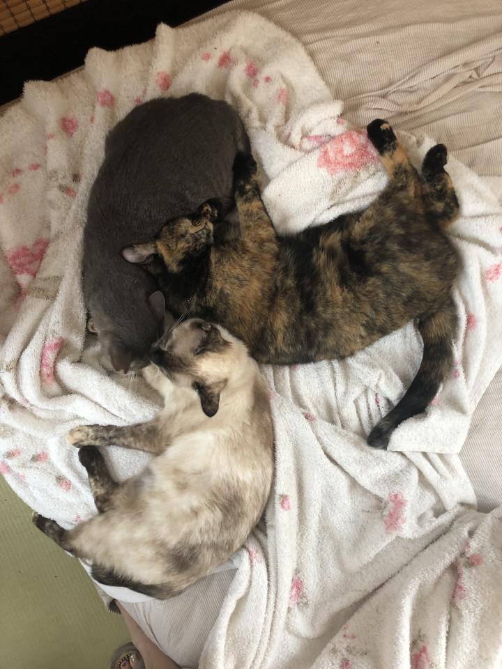 現在もうすぐ1歳になるエマちゃんと、トイプードルの老犬15歳二匹とも大人しく仲良しです。8月にハチとロクを迎えまして、朝方運動会を毎日しております。 エマちゃんが、猫語で、何やらニャ〜ニャ〜ウニャ...