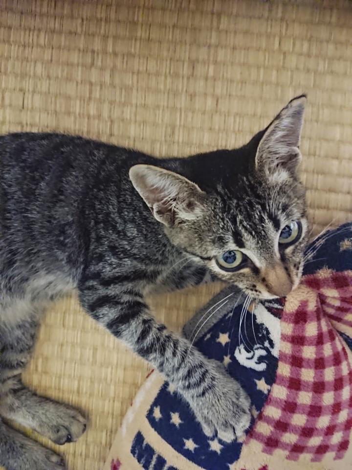 2019年10月08日に野良猫を保護して家族になりました?推定5ヶ月のキジトラの絃(いと)ちゃんです?先住犬2匹と暮らしてます。仲良くして下さい。