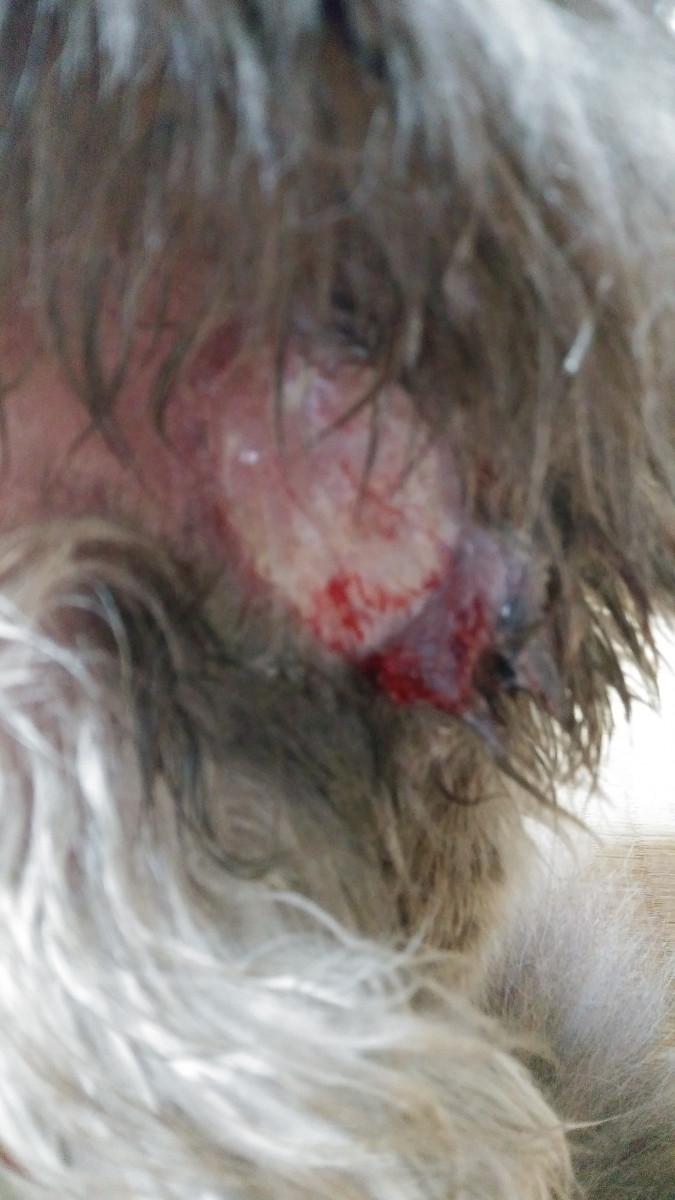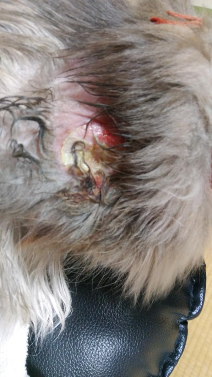 なので付着したら直ぐにその付着した毛を取ってあげて、膿を拭いて、傷口をキレイにしたら1日2回薬を塗って。
