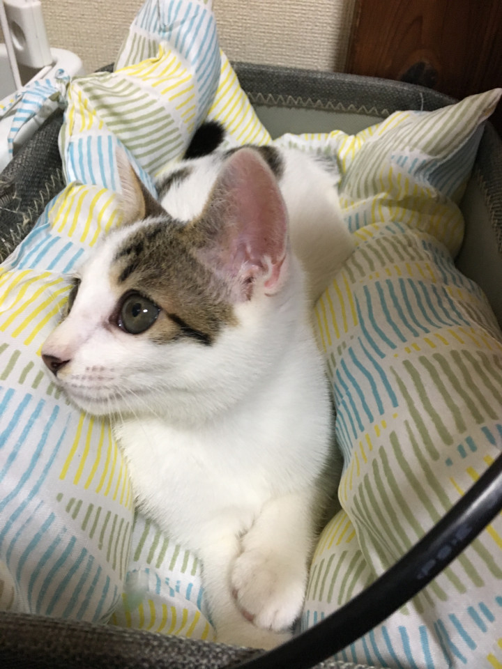 ミルクは普段入らない簡易ネコベッドで初くつろぎ笑