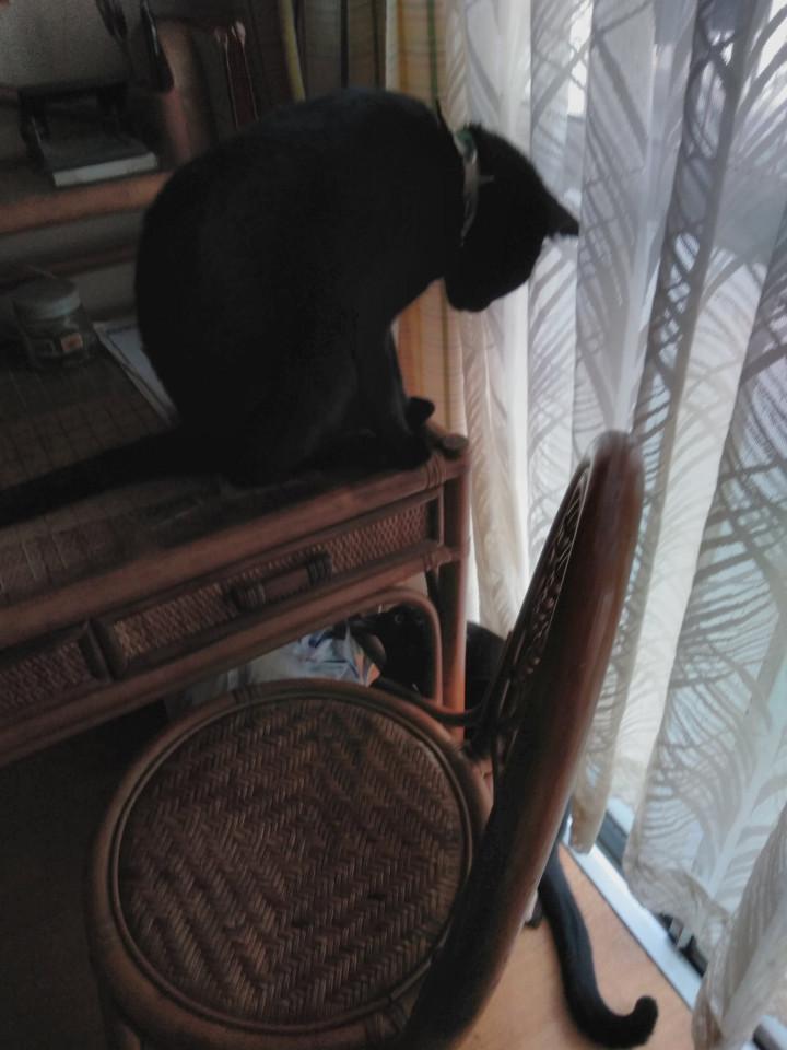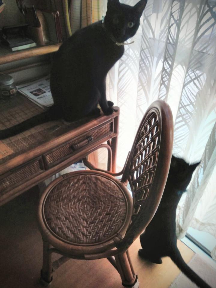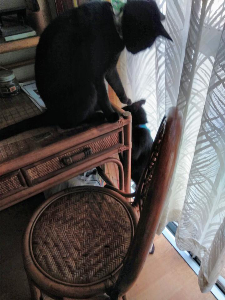どうやら勉強机に上ってカーテン越しに外を見ていたベルくんが羨ましくて、シーくんも行きたいらしいのですが…