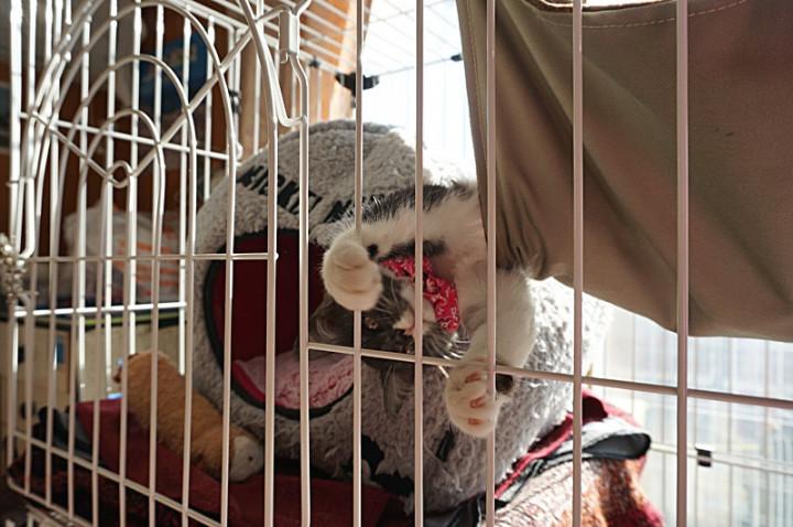 土砂降りの中、家に帰って兄に三段ケージを組み立てて貰い、その間バッグの中でニャーニャーないていました。
