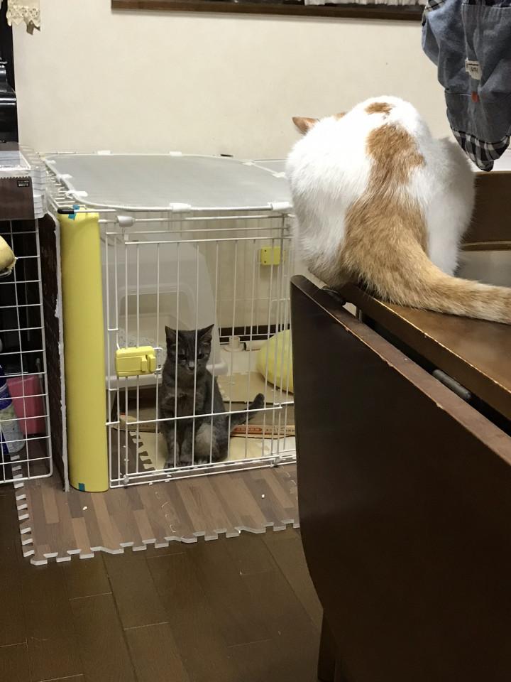 来て3日目に、姉さんが本気の威嚇とガブッとやったから、そりゃ怖がるわよ、ガンつけてるし。