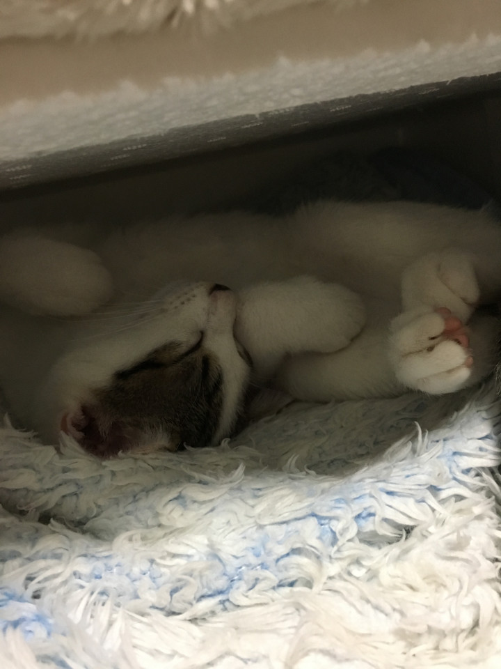 猫ハウスの上に手を伸ばして、こちらも爆睡笑