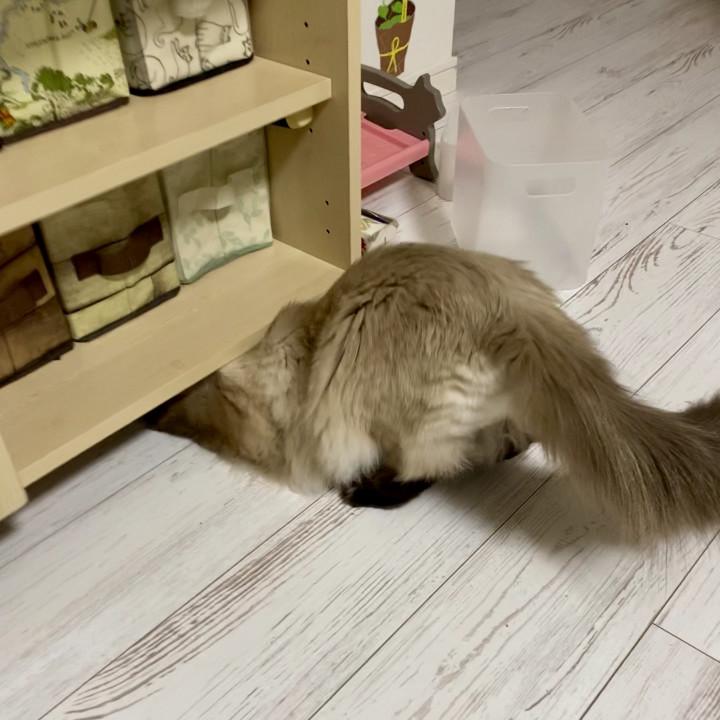 たまらず隠れようとするも、赤ちゃん時代に入れたはずの隙間に引っ掛かる雷牙🙀
