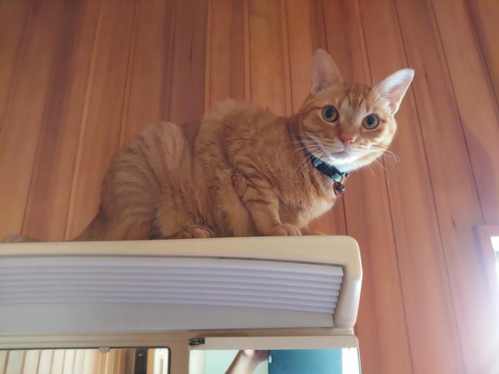 はい、朝から茶太郎が顔を洗うのに前かがみになったおいらを踏み台にして、颯爽と?鏡台に駆け上がっていきました⁉️
