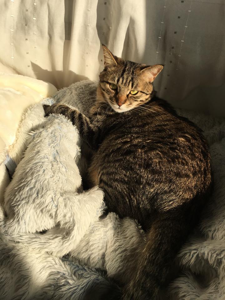 日差しで部屋がポカポカだったのでちょっと部屋の換気をしようと網戸にしたら、直射日光を求めて移動してきました笑