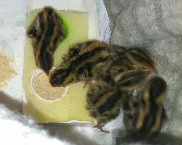 エサは生後20日までは、Amazonで購入した「ドリームウズラヒナ」を与えます。