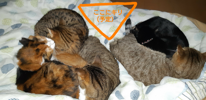 消灯時はカリタと一緒にいたのはドラくんだけだったけど、夜中に気づけば全ニャン集合🐈