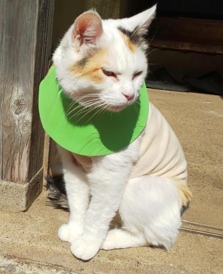 なんだか前足はグルグル巻きだし、おなかが痛くて、上手く動けない。自慢の毛並みも刈られるし、散々だったわ。それも、三回も。