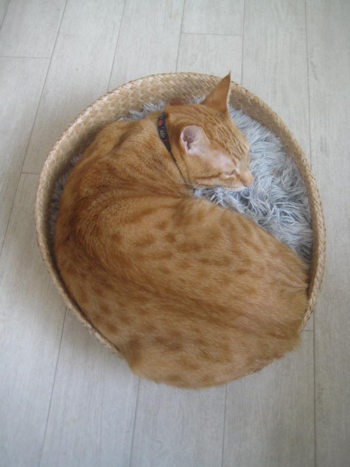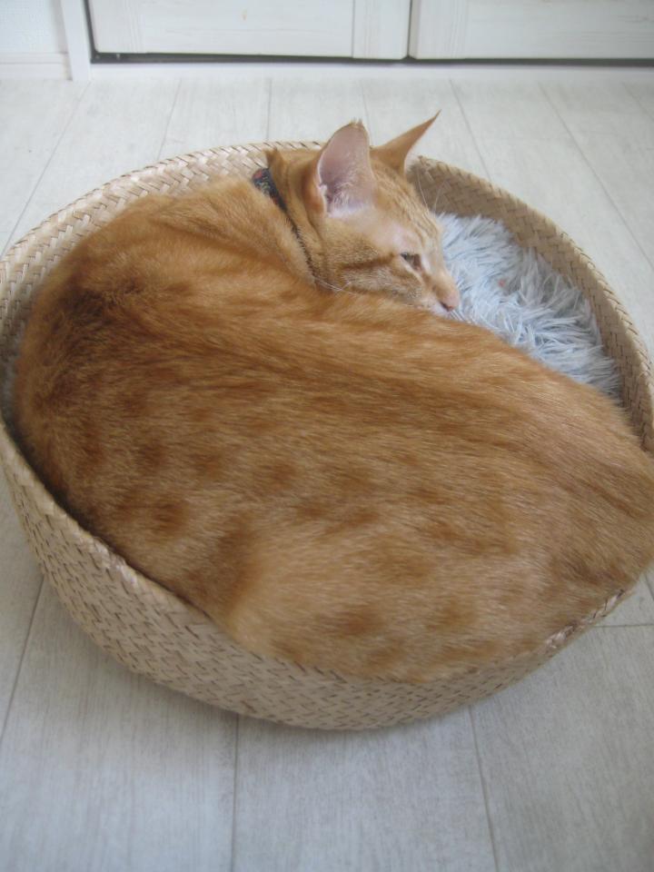 ふわもこクッションの入ったカゴで寝ています。