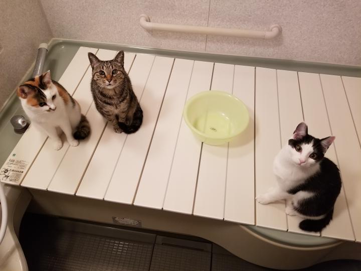 お姉ちゃん達の真似をして一緒にお風呂に入るようになりました。(正確には蓋の上だけど)3人で母ちゃんが来るのを待っています( *´艸)