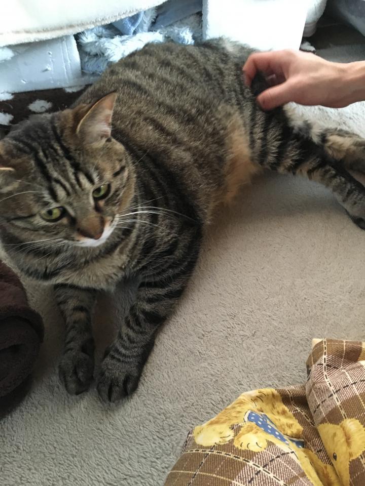 主人がお尻をナデナデしたらお腹を出して脚伸ばしきってニャーン☺️