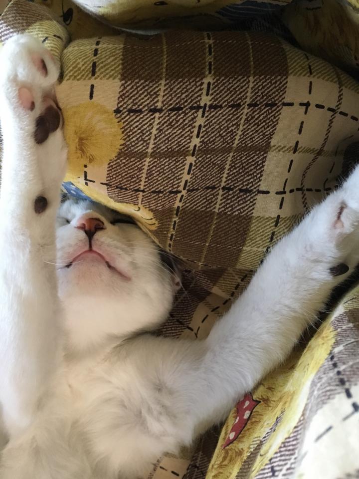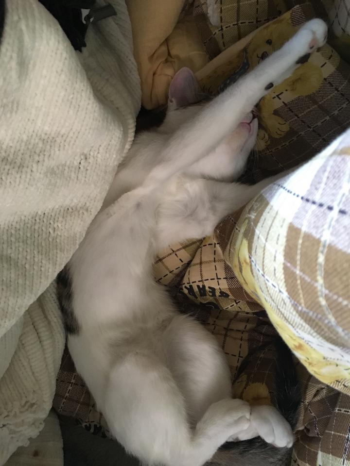 夜中、私の隣でヘソ天して寝てるけど上から見た図はこんな感じなのね笑