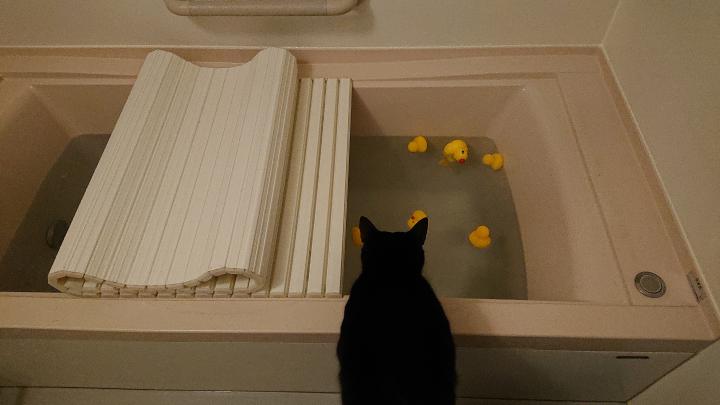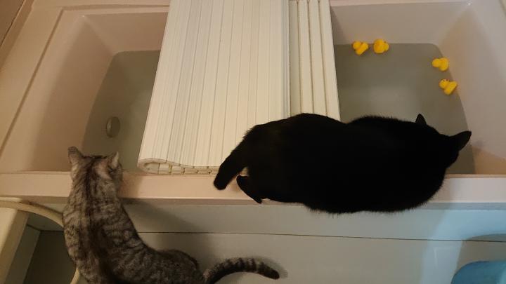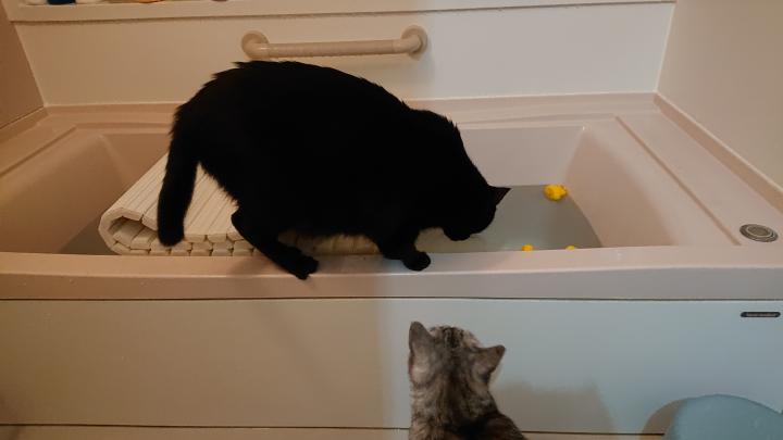お風呂を沸かしアヒルちゃんを浮かべたら、それを見たげんさんとあんちゃんが大興奮。