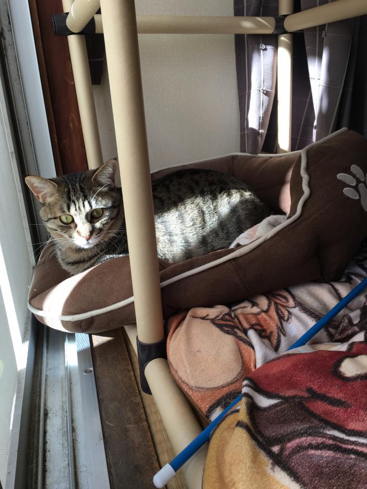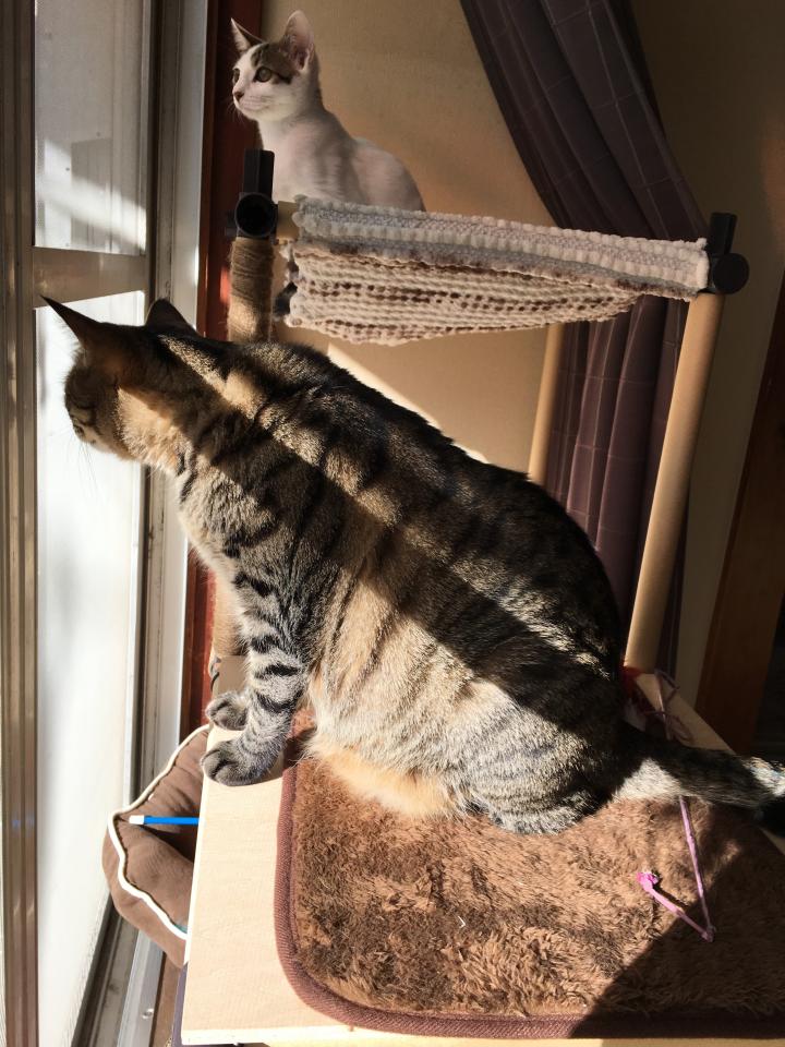 最上部のニャンモックはミルクに先に場所取りされて占領されてしまったので、二階部分でお外パトロール兼日光浴🌟