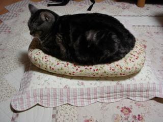 サンタは、この楕円形(クリーム色)のクッションが好きみたいです。