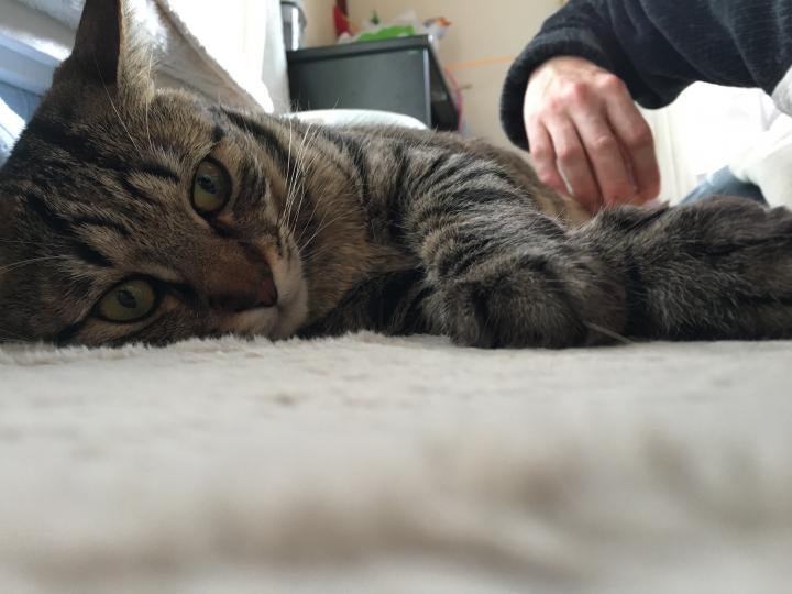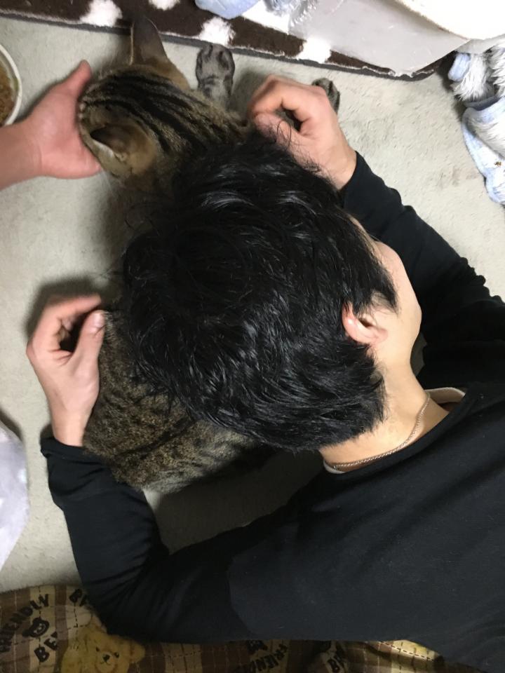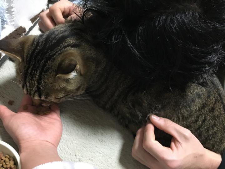 主人に枕にされながら両手でナデナデをされ、尚且つ私の手からご飯を食べていたんです(・ω・`)
