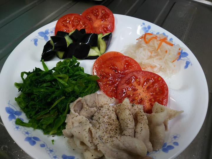 ・せり・トマト・豚肉・オナマス・茄子の浅漬け 😆(笑)